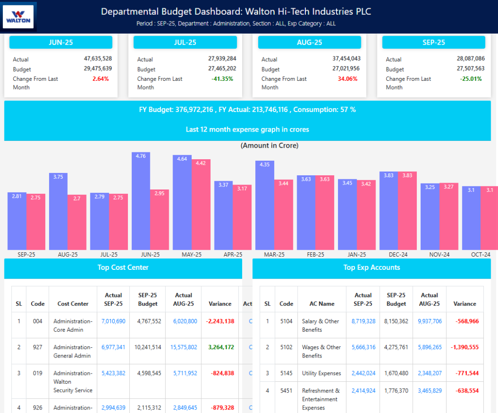 Integrated with Oracle EBS, this dashboard tracks real-time departmental budget vs. actual spending. It features a 12-month expense trend and identifies top cost centers to help management monitor financial health and optimize spending