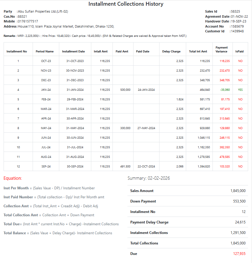 This automated system tracks hire sales and installments in real-time. It features automated delay charge calculations, monitors total collections vs. dues, and streamlines the entire payment management process for better financial accuracy.