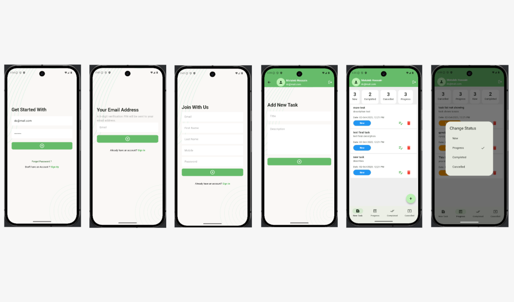 This Task Manager app features a clean and modern user interface designed for seamless productivity. It allows users to efficiently create tasks, track their progress, and categorize them into different statuses like New, Completed, or Cancelled. With its intuitive navigation and organized dashboard, managing daily goals and staying on top of deadlines becomes effortless.